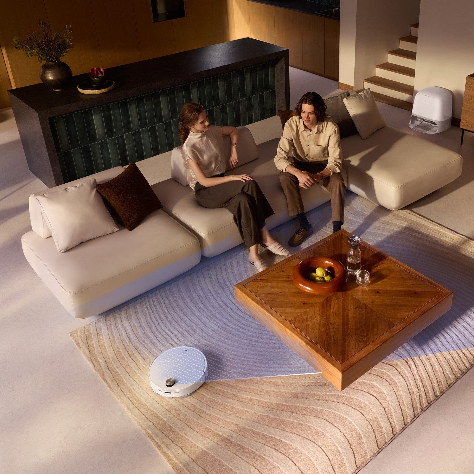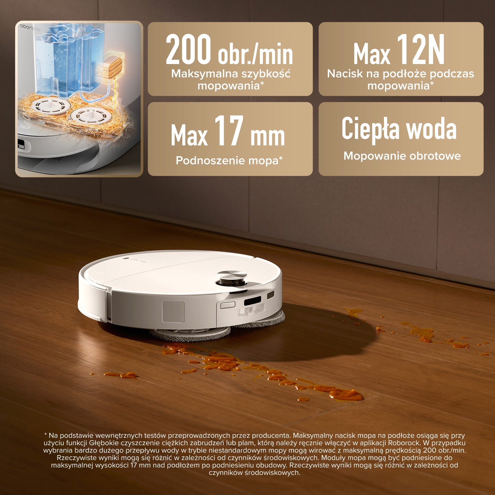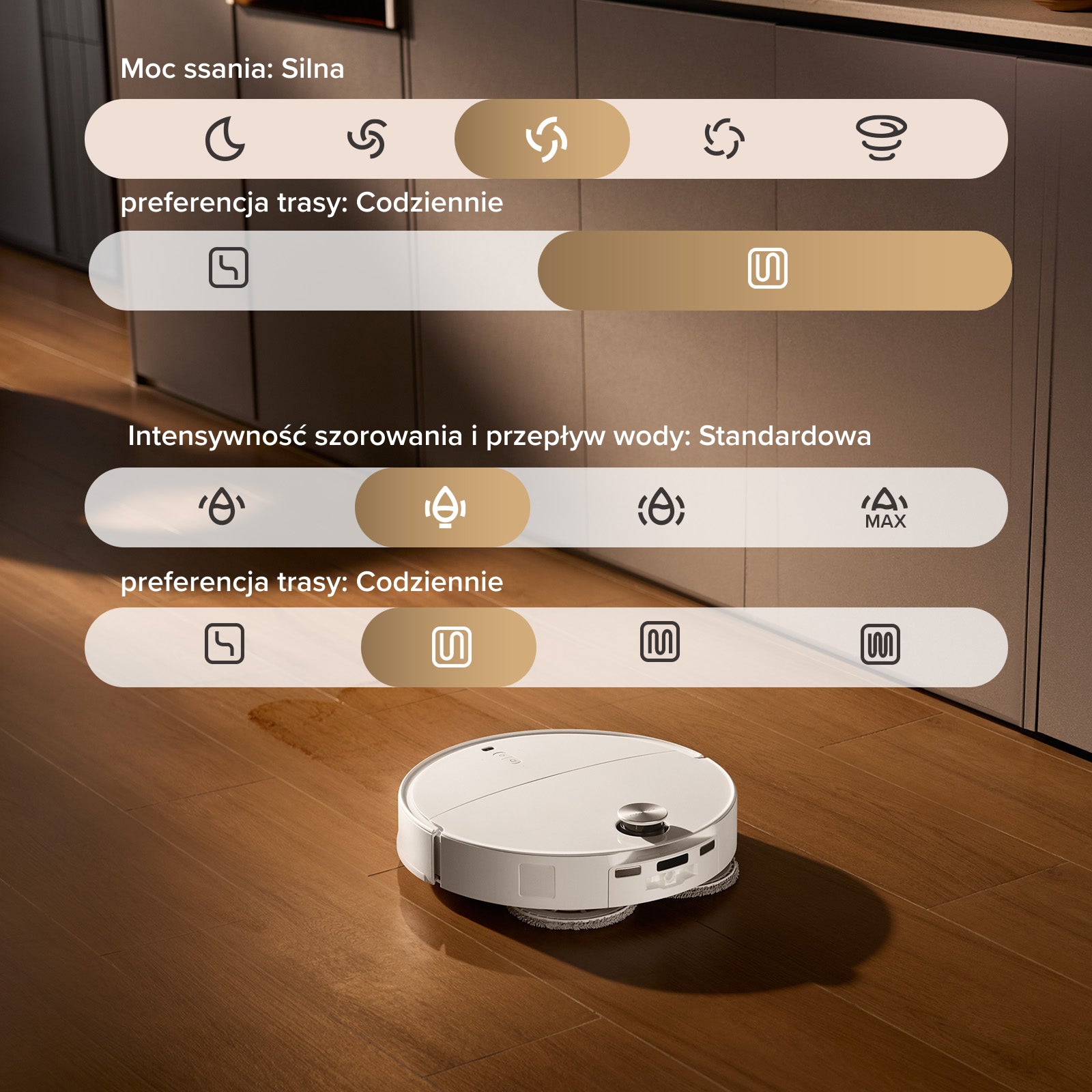 Ustaw tryb cichego sprzątania na noc i wybierz najwyższy tryb szorowania suchych plam na podłodze, aby rano cieszyć się świeżością!