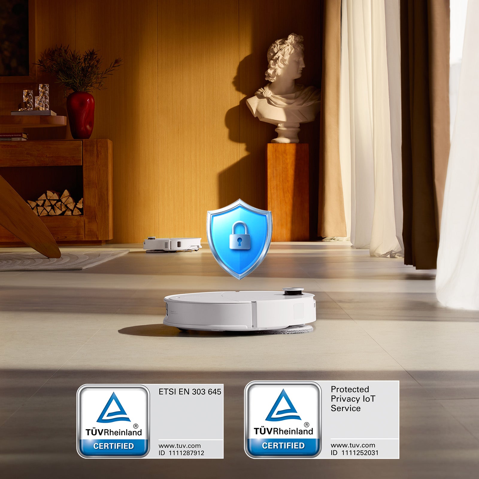 Qrevo CurvX nie przechowuje żadnych obrazów, dzięki czemu możesz liczyć na pełną prywatność i bezpieczeństwo. Jest opatrzony certyfikatem TÜV Rheinland, który potwierdza, że jest bezpiecznym produktem do inteligentnego domu i spełnia wymogi norm cyberbezpieczeństwa ETSI EN 303 645.