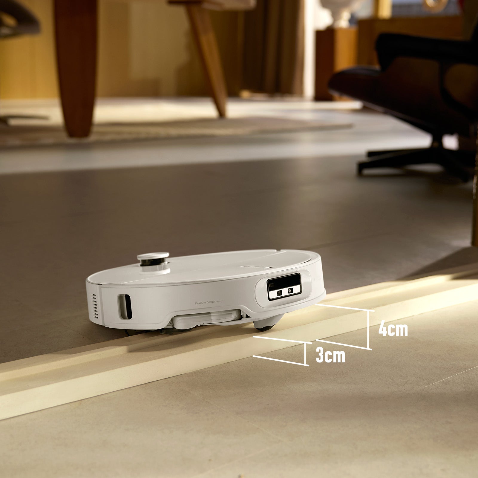 W otwartych przestrzeniach Czujnik LiDAR pozostaje podniesiony, zapewniając skanowanie panoramiczne w zakresie 360° na potrzeby tworzenia bardzo dokładnych map i wykresu najwydajniejszej ścieżki sprzątania. Pod niskimi meblami Czujnik LiDAR automatycznie chowa się, przełączając na 100-stopniowe pole widzenia z tyłu – dopracowane pod kątem dokładności w ciasnych miejscach.