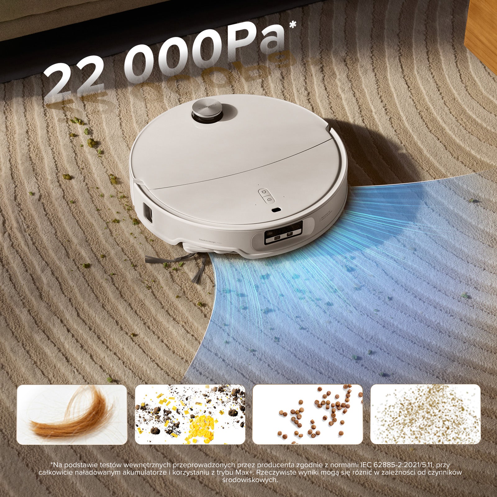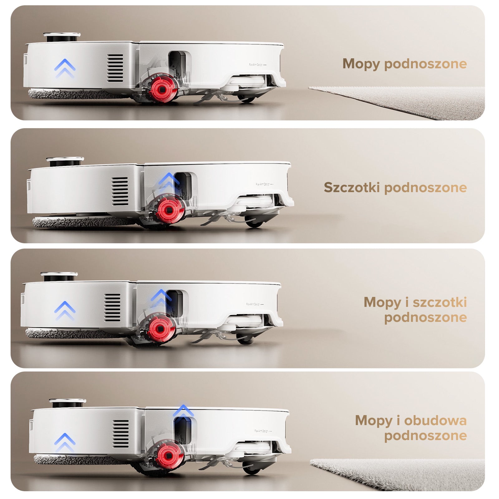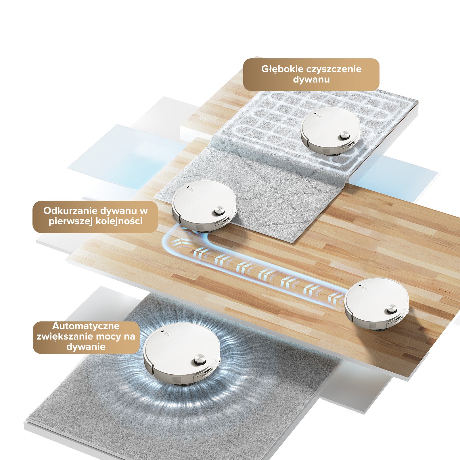 Automatyczne zwiększanie mocy na dywanach: Zwiększ siłę ssania na dywanach. Głębokie czyszczenie dywanu: Sprzątaj dywan dwukrotnie w każdym pokoju. Najpierw odkurz dywan: Najpierw odkurzaj dywan przy suchym mopie. Następnie zacznij mopowanie.