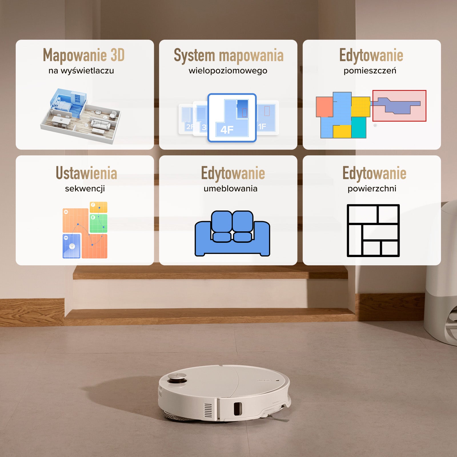 Edytuj pomieszczenia: Łącz pomieszczenia, dziel je, nazywaj i usuwaj z mapy swojego domu. Edytuj umeblowanie: Edytuj meble, takie jak lustra podłogowe, sofy, zestawy jadalniane, kuwety dla kotów i drapaki dla kotów. Ustaw sekwencję: Automatycznie lub ręcznie ustaw sekwencję czyszczenia dla każdego pomieszczenia. Edytuj powierzchnię: Rodzaj podłogi, dywan, próg, pod meblami Spraw, aby sprzątanie było precyzyjniejsze!