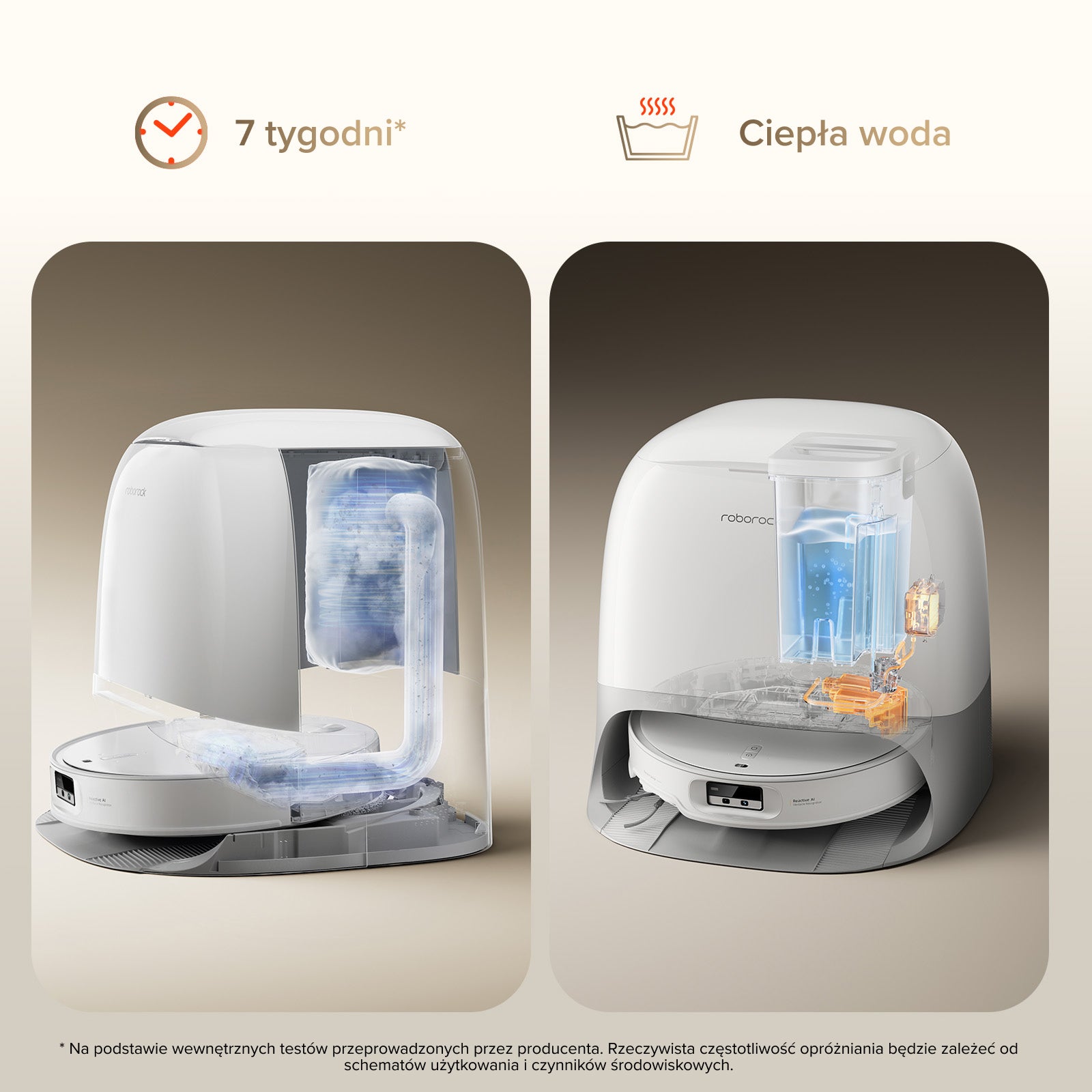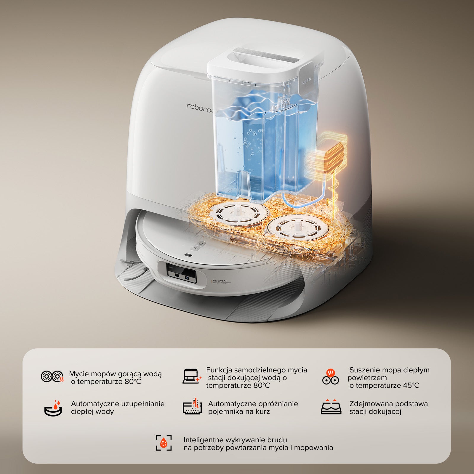 W razie potrzeby automatycznie napełnia zbiornik robota ciepłą wodą.