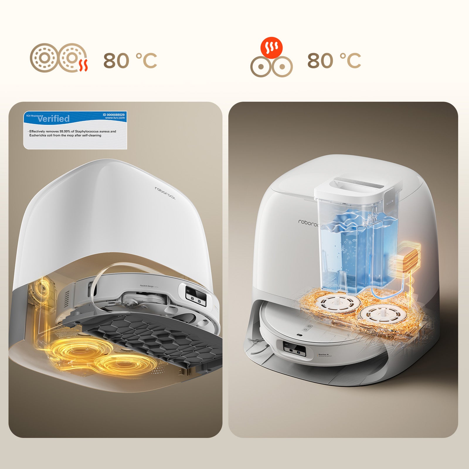 Wykorzystuje gorącą wodę o temperaturze 80°C13 do rozpuszczania uporczywych plam i tłuszczu, zapewniając dokładne czyszczenie mopów i utrzymanie higieny podczas każdego użycia. • 99,99% usuwanych bakterii*14 • Tryb prania: Inteligentny/Zrównoważony/Lekki/Głęboki • Temperatura wody: Pokojowa/Ciepła/Gorąca
