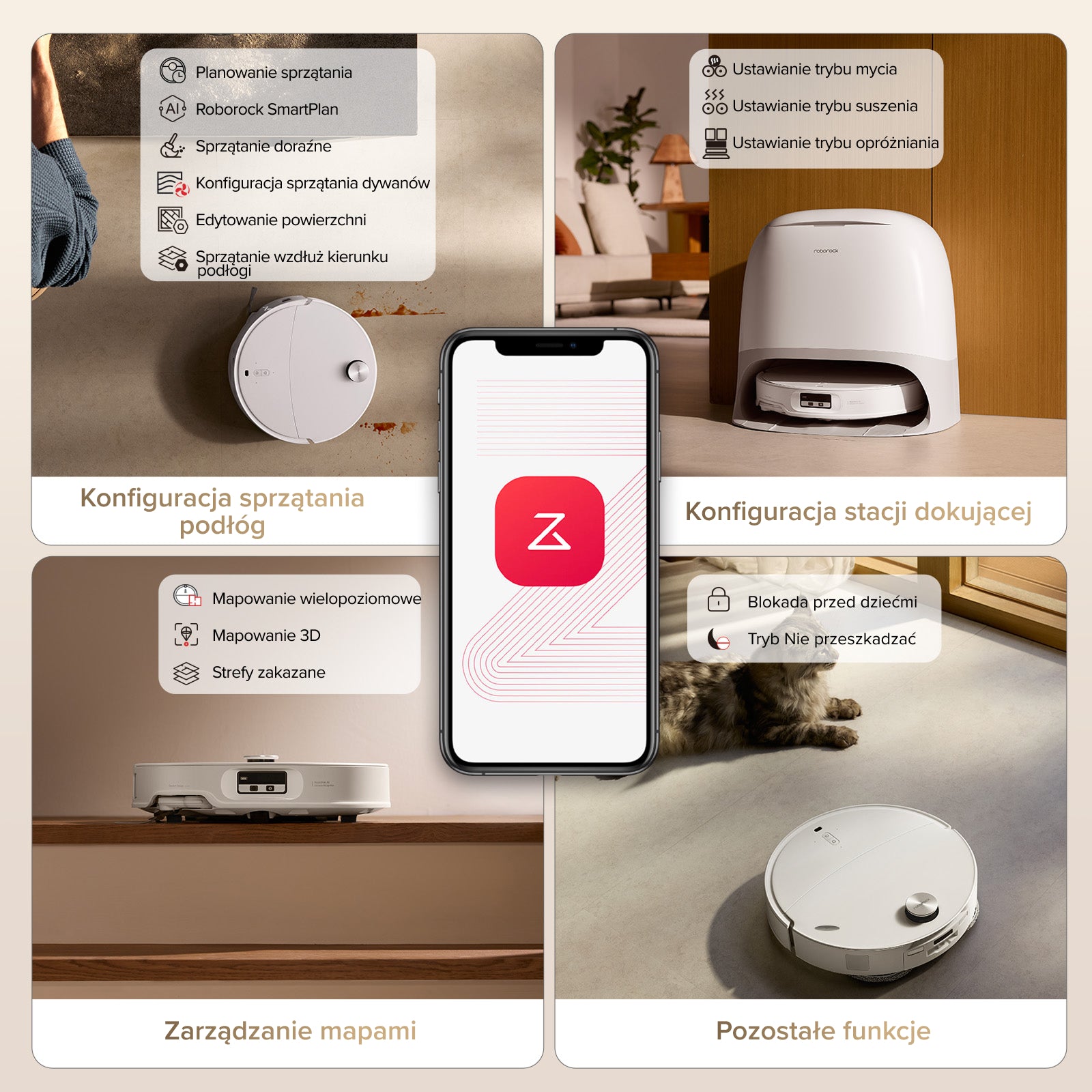Planowanie sprzątania, zarządzanie mapami, ustawianie trybów stacji dokującej i sprawdzanie inteligentnych funkcji – wszystko w aplikacji Roborock.